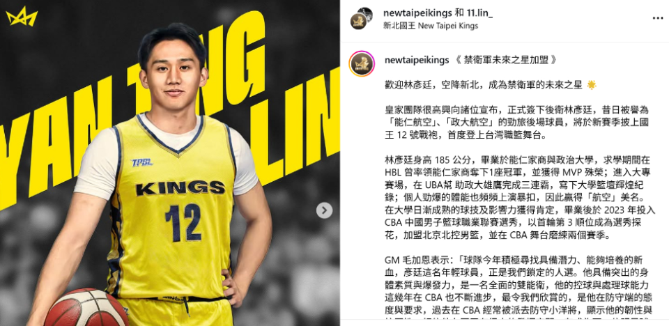 如今新北国王官宣签约林彦廷,并且晒出林彦廷加盟的海报,他新赛季将身穿12号球衣。