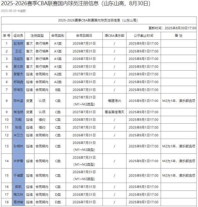 8月30日讯 CBA官网更新了山东男篮新赛季的国内球员注册信息,山东共注册了18人。